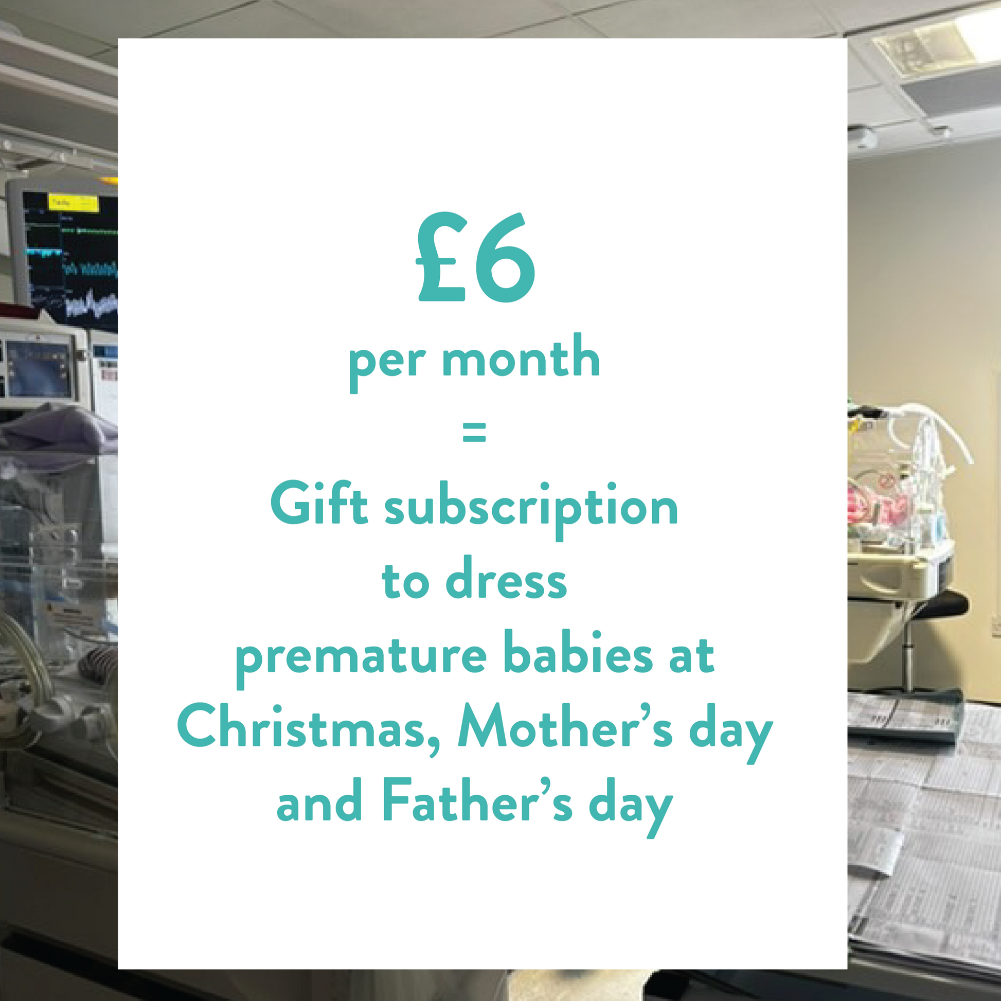 By buying this "Gift my NICU" £6 monthly subscription, you are directly sending the gift of a first Nicu baby outfit to a family in hospital having a particular hard time at Christmas, Mothers Day and Fathers Day.