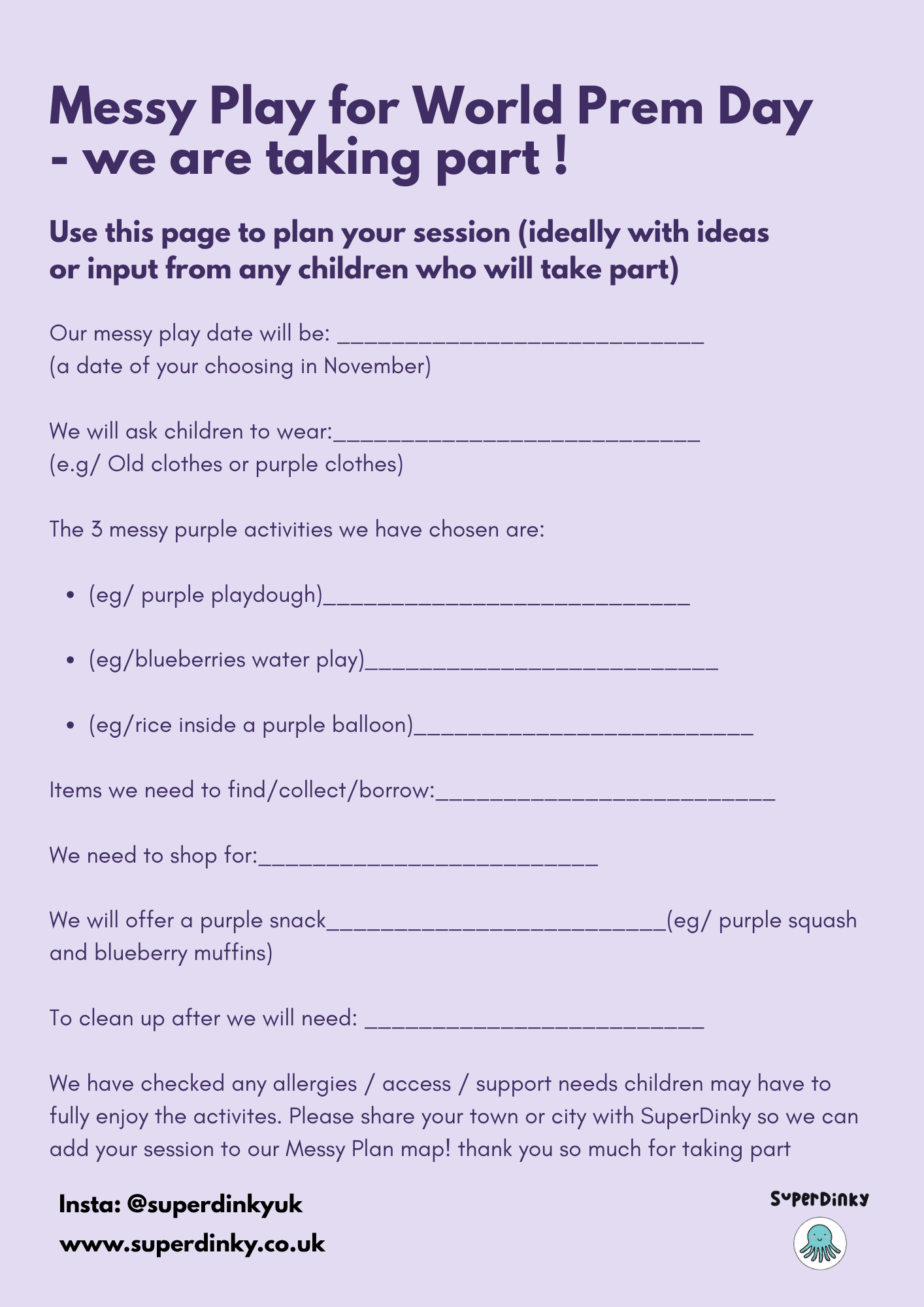 We’ve created this resource to give you easy, low-cost messy play ideas that celebrate World Prem Day and raise awareness of NICU and prematurity. Everything except the actual mess — just lots of simple, purple-themed activities you can do with things you already have at home, school, or preschool.