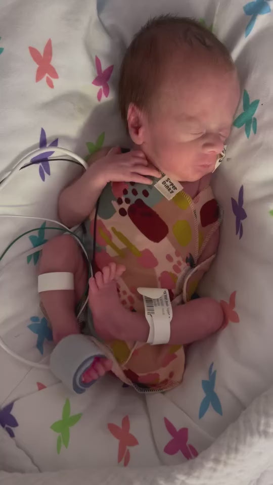 The perfect first outfit for a baby being cared for in a neonatal unit. Our organic cotton wrap vest has been specially designed for NICU/SCBU babies. All our prints are gender neutral, with a wrap feature making it easy to remove for observations by medical staff or skin to skin with parents. No harsh seams to irritate, super soft fabric with velcro that does not touch delicate skin. Back label features non toxic, vegan ink.